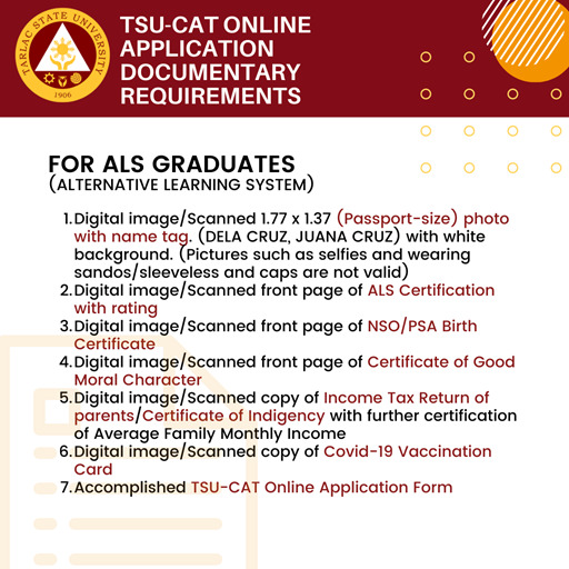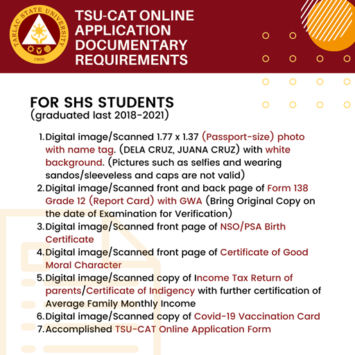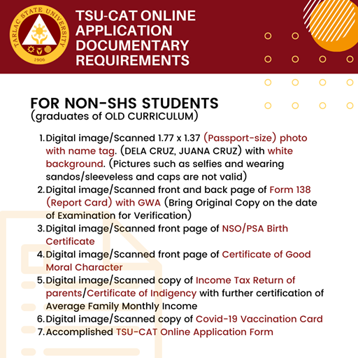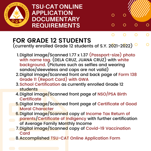 In preparation for the TSU College Admission Evaluation for Academic Year 2022-2023 (TSU CAE) online application and uploading of scanned/digital copies of credentials/requirements at https://cat.tsu.edu.ph, here is the list of online application documentary requirements.