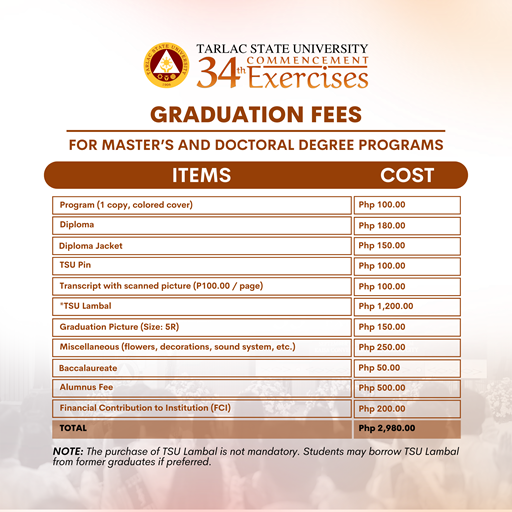 To all candidates for graduation of the 34th Commencement Exercises this September 2023, the Tarlac State University will conduct face-to-face graduation ceremonies on September 27, 2023.