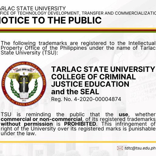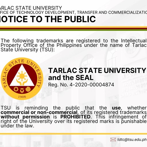 The following trademarks are registered to the Intellectual Property Office of the Philippines under the name of TARLAC STATE UNIVERSITY (TSU)