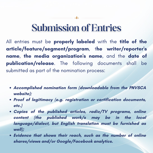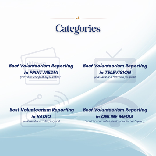 This award is a collaborative effort between the Philippine National Volunteer Service Coordinating Agency (PNVSCA), Philippine Information Agency (PIA), Philippine Association of State Universities and Colleges (PASUC), Department of Public Works and Highways (DPWH), and the Ayala Foundation Inc. (AFI), celebrating outstanding media practitioners and organizations that champion responsible and ethical media practices.