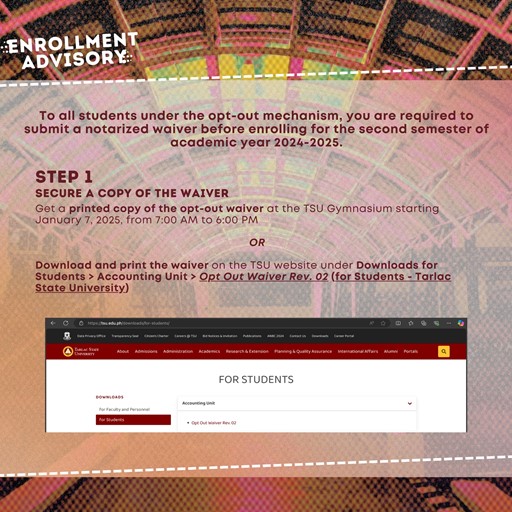 You can secure a copy of the waiver at the Office of the University Legal Counsel at the TSU Gymnasium during the enrollment period from 7:00 AM to 6:00 PM or download and print the waiver on the TSU website under Downloads for Students > Accounting Unit > Opt Out Waiver Rev. 02 (https://tsu.edu.ph/downloads/for-students/).